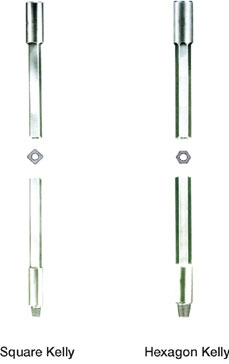 Notes: Any kind of combination of hexagon kelly and left hand connection of other models and sizes is available. • When inquiring or ordering, please specify: • Kelly type (square or hexagon) • Nominal size and bore diameter • Overall length • Connection size and type • Thread protector type |